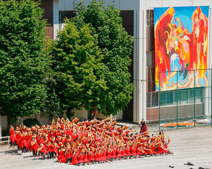 学年が一体となる名物の「応援交歓」(上の写真)や、3人4脚、2人3脚、2人2脚、1人1脚でたすきを繋ぐ「足の歴史」、曲に合わせて身体表現をする「団体徒手」など工夫を凝らした団体種目も多く、運動が得意でない生徒も意欲的に取り組める構成です。