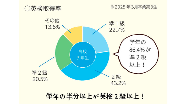 「中3で多くの生徒が準2級に合格しています。年3回の「英検DAY」を設けて、学校を英検1次試験の準会場にするなど、英検にチャレンジしやすい環境も整えています。2次面接対策では希望者全員が1対1の指導を受けることもできます。大学入試においても、英検利用型入試に積極的に出願しています」