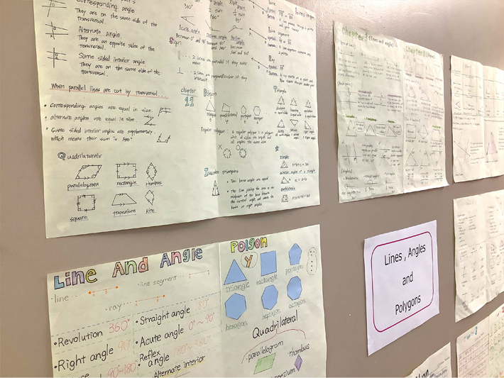 取材後、校内をご案内いただいた廊下の壁には、生徒たちが英語でまとめたレポートがたくさん掲出されていました。写真は“Line, Angles, and Polygons”とあり、数学を学ぶうえで必要となる概念について生徒が振り返り学習でまとめたもの。めくって読むようになっていて、受動的な学びではなく、生徒が進んで参加して楽しんで学び、その成果を他者と分かち合う様子は、保護者の方にも好評だと言います。また生徒へのアンケートで「インターナショナルコースに入ってよかったと思いますか」の質問に100%が「よかった」と回答。「毎日英語の授業を行うので、前よりもコミュニケーション能力がついた」「周りのみんなも沢山発言していたから自分も沢山発言でき、発言力が上がった」「みんなの前で英語を実際に話す実践の場があるから、どう伝わるか、どうすればもっと自分の言いたいことが伝わるかを毎日学べる」などのコメントも寄せられており、満足度が高い聖ドミニコの英語教育、かなりおすすめです。