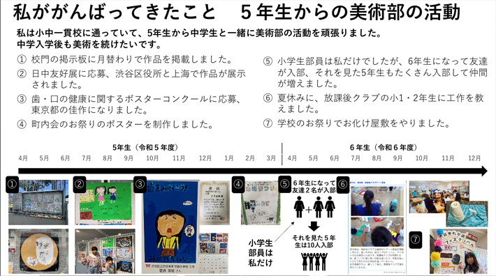 小5の時から参加していた小中合同の美術部の活動をアピールしようと思いました。絵が好きで、ポスターコンクールに入賞したこともあるので、それもアピールできると思いました。